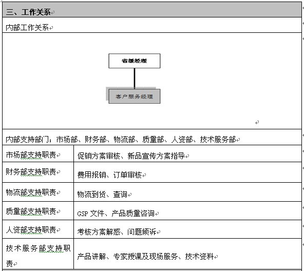 二、編寫銷售崗位說明書,必須遵循“源于崗位一線”的原則。三個要求:(1)誰明白(市場特點:產(chǎn)品銷售處在的階段、產(chǎn)品擁有的終端用戶和購買習慣、經(jīng)銷商的首要需求、銷售活動組織形式)、誰起草,如果人力資源部門是起草人,就必須深入到銷售一線崗位了解市場情況再打草稿;(2)與銷售人員的實際能力匹配(閱歷和能力);(3)明確銷售支持部門(人員)的職責(姓名、聯(lián)系方式)。