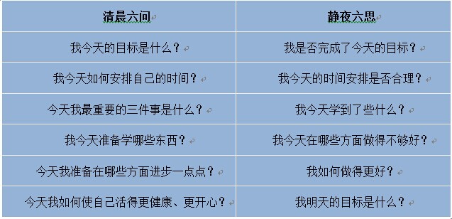 有公司管理人員專門設(shè)計(jì)了一個(gè)“員工每天自我思考六問六思”表,在很多企業(yè)運(yùn)行,并且反映效果不錯(cuò)。